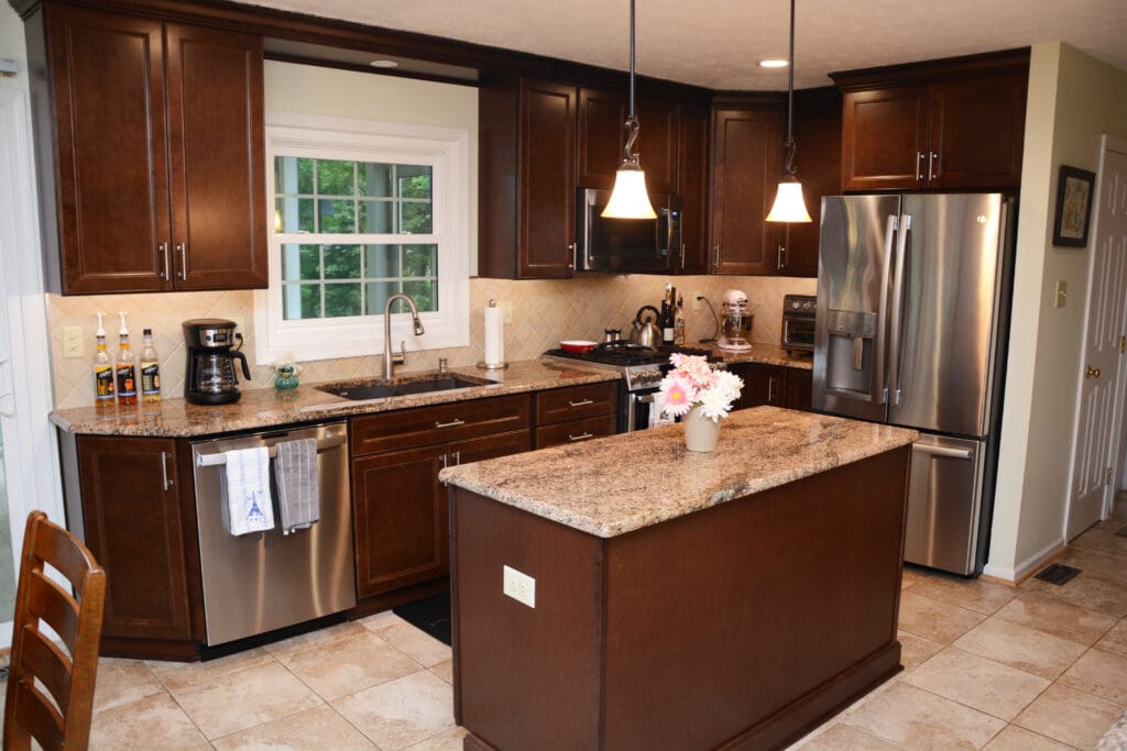 Working along with Rebecca, the family selected Homecrest Cabinetry with Eastport Maple door style and Bison finish. The countertops are Key West Gold granite. The new kitchen now has plenty of storage space, while also being functional and creating a very easy flow.